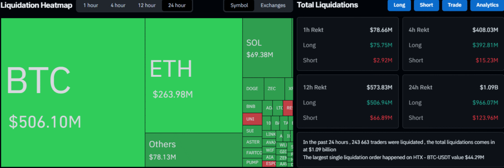 Data from CoinGlass shows total liquidations reached nearly $1.1 billion for the day. Long positions made up most of that number, with $966 million cleared. Short liquidations were far lower, at $124 million. The largest single liquidation was recorded on HTX, where a $44.29 million position was closed.