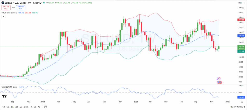 Solana is being tested at key support and resistance zones using technical analysis. A weekly chart shows that the lower Bollinger Band at $122.92 was tested, suggesting a possible support point. If SOL can stay above this, it may move to the mid Bollinger Band resistance of 186.74. The next level of bullish momentum is the Bollinger Bands upper band at 250.59.