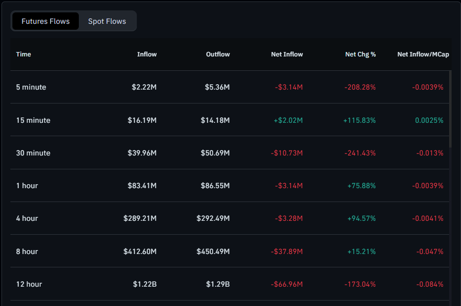 Over the 8 hours, the growth of long positions was 15.21, but short positions remain preponderant, indicating restraint in trading. The 12-hour window is more bearish, with short positions at 1.29 billion, versus 1.22 billion in long positions. The fact that net long intraday positions decreased suggests the uncertainty of traders or potential profit-taking.
