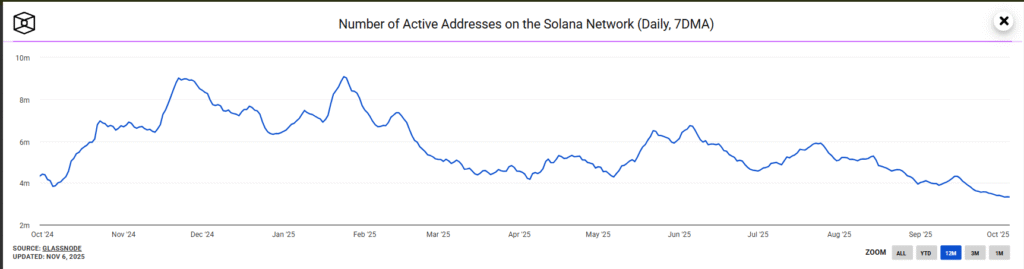 In January 2025, Solana recorded more than 9 million active addresses, but by November, the number had fallen to just 3.3 million.