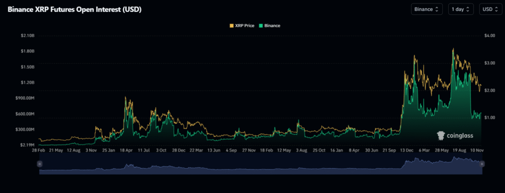 At the same time, XRP continues to trade within a declining channel, yet buyers have started to reenter from the lower boundary, according to recent XRP USDT charts. Rising long to short ratios on major venues like Binance and OKX coincide with that rebound, showing that some participants are positioning for a counter move rather than pressing the downside.