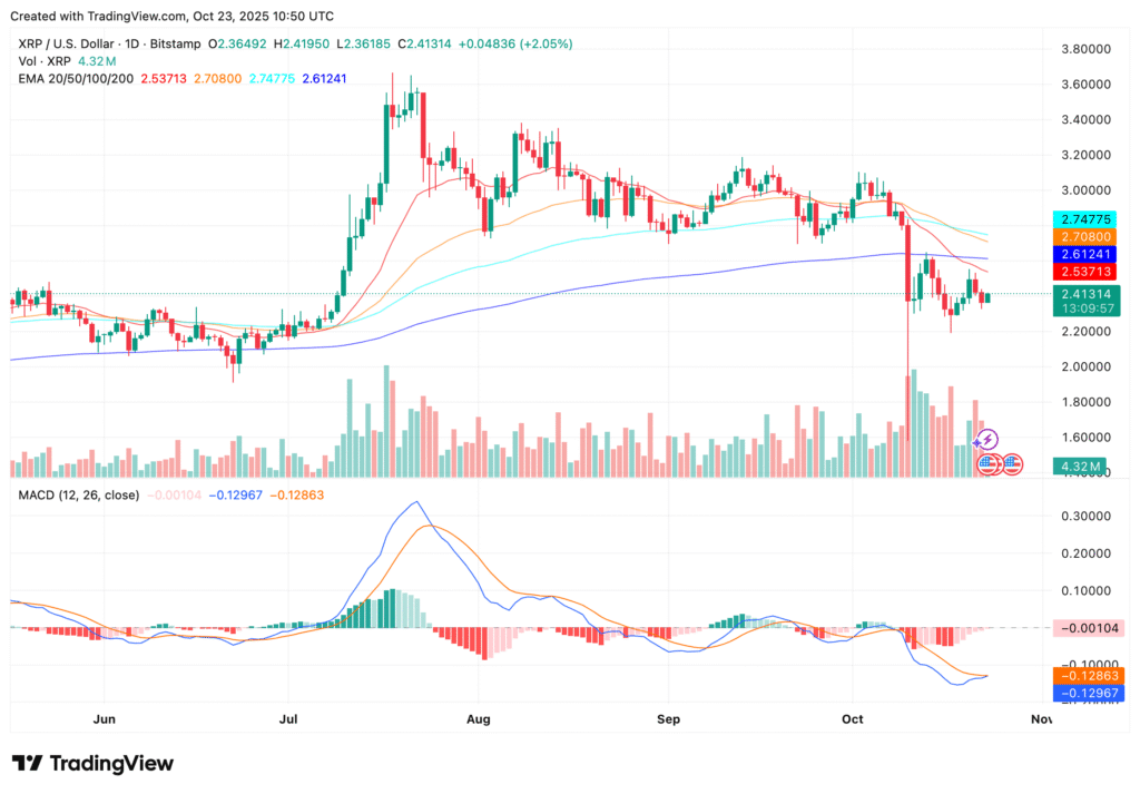 XRP is currently trading around $2.41, holding firm above a critical support level at $2.40 after a volatile October. The digital asset has seen intraday highs and lows of $2.42 and $2.36, respectively, with a broader yearly range between $0.48 and $3.66. Despite recent price weakness, XRP has rebounded 7.5% over the past week and is up 438% year-on-year.