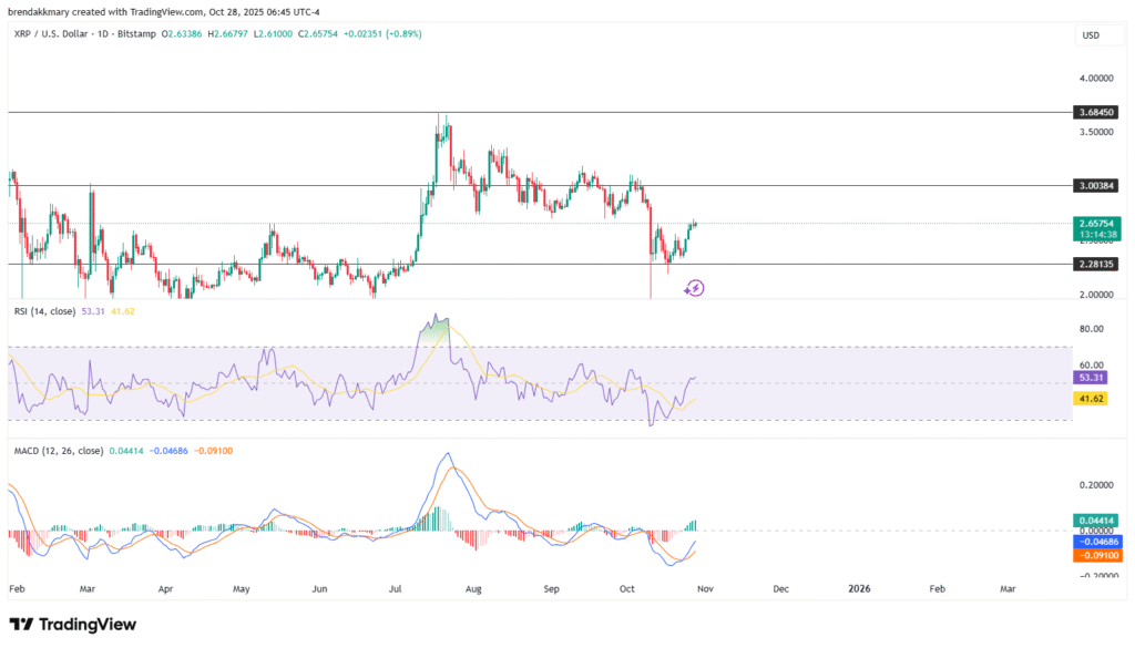 Historically, November has been XRP’s best-performing month, averaging gains of 88%. With exchange reserves at multi-month lows, analysts suggest this seasonal trend could align with renewed momentum, especially if resistance levels are breached. Current support stands between $2.61 and $2.63, while resistance stretches from $2.70 to $2.81.